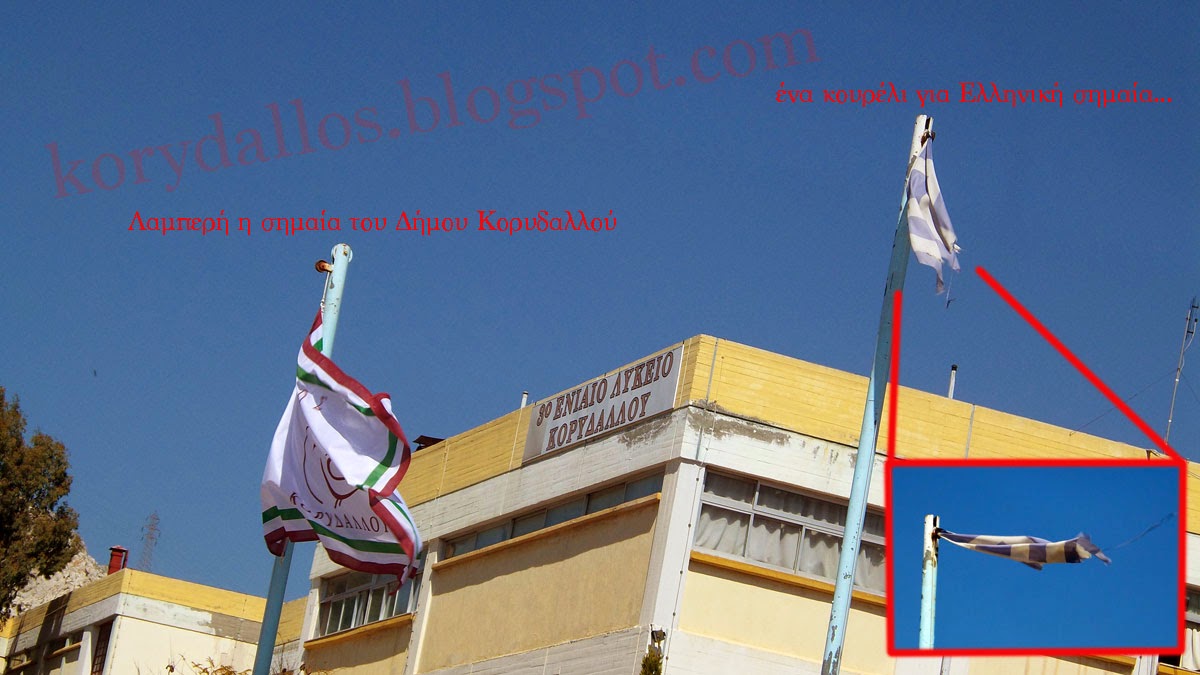 Την ίδια στιγμή που η μεγάλη αστραφτερή σημαία του Δήμου Κορυδαλλού κυματίζει στο ΕΑΚ Κορυδαλλού δίπλα στο 3ο Ενιαίο Λύκειο Κορυδαλλού.